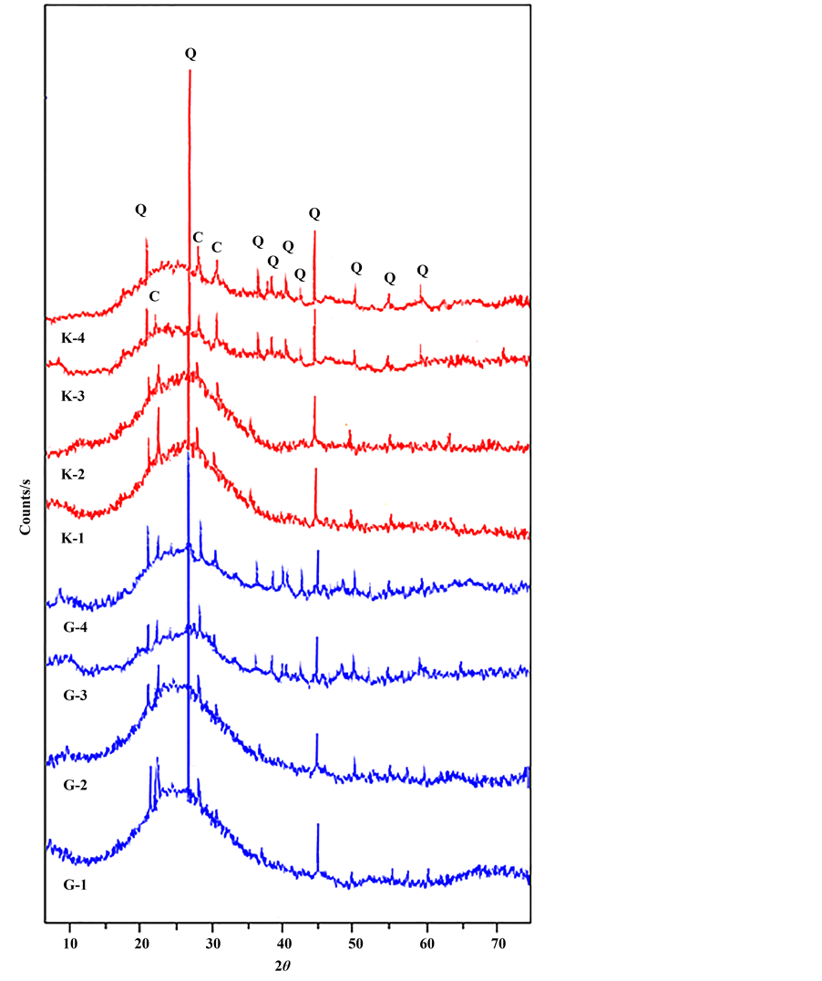 Among these four characteristic peak regions, the Si-O symmetrical bending vibrational peak at 695 cm−1 of the octahedral site symmetry is unique to the crystalline materials. It is well known that in the infrared spectra of amorphous silica the symmetrical bending vibration of the Si-O group found at 695 cm−1 is absent. Amorphous silica is one of the polymorphous of silica and at high temperature it can easily transform from quartz. Amorphous silica exhibits a relatively moderately strong peak at 800 cm−1 and it can be distinguished from the band of crystalline silicate [24] . Therefore, the symmetrical bending vibration of Si-O group obtained at 695 cm−1 is the diagnostic peak in determining the short range parameter of the quartz, whether it is crystalline or amorphous [20] [25] .