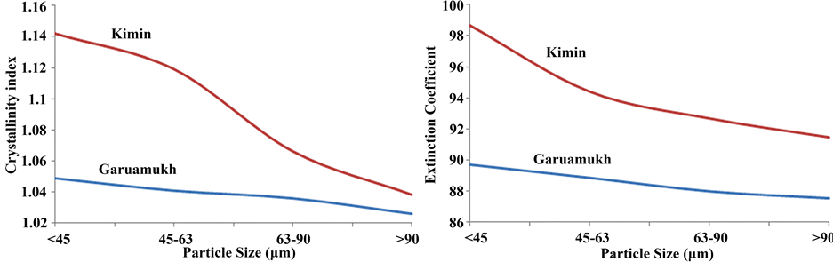 Figure 4. Variation of crystallinity index and extinction coefficient against the particle size in Kimin and Garuamukh fulgurites.