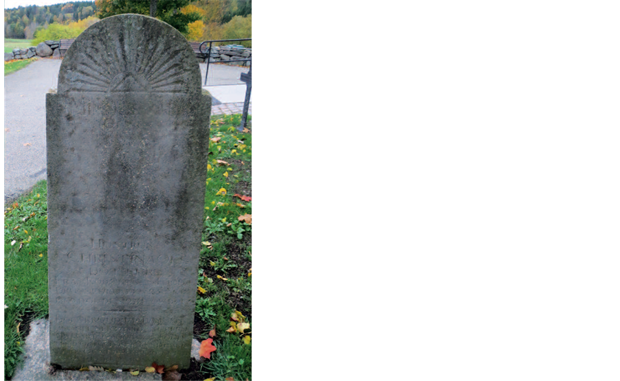 Figure 2. A narrow, rounded limestone gravestone with a radiant triangle on its top commemorating the wife Christina Olsdaughter from a small farm in Torp who died of cold in 1847, 48 years old.