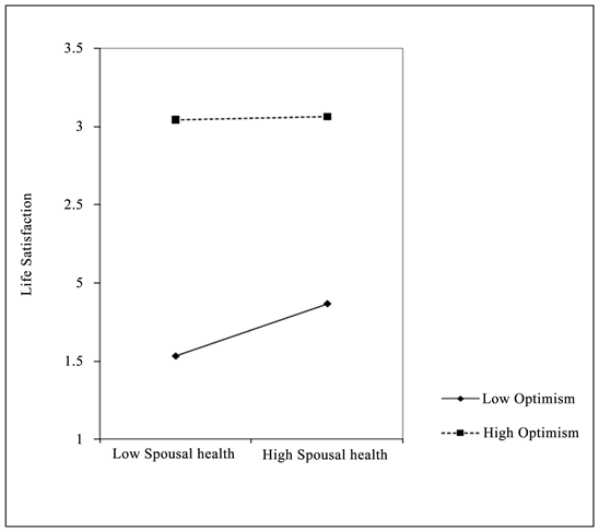 Hypothesis 2: Elderly people’s optimism moderates the relationship between spousal physical health and their life satisfaction such that this relationship is stronger when their optimism is low than when it is high.