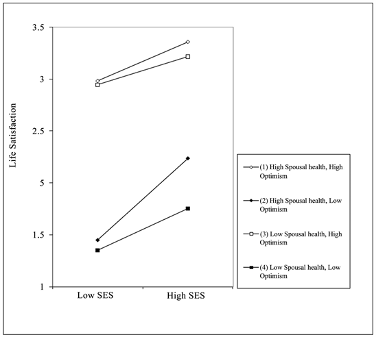 Hypothesis 3: There is a three-way interaction between elderly people’s SES, optimism, and spousal health such that when optimism is low rather than high, the moderating effect of SES on the relationship between spousal physical health and life satisfaction will be stronger.