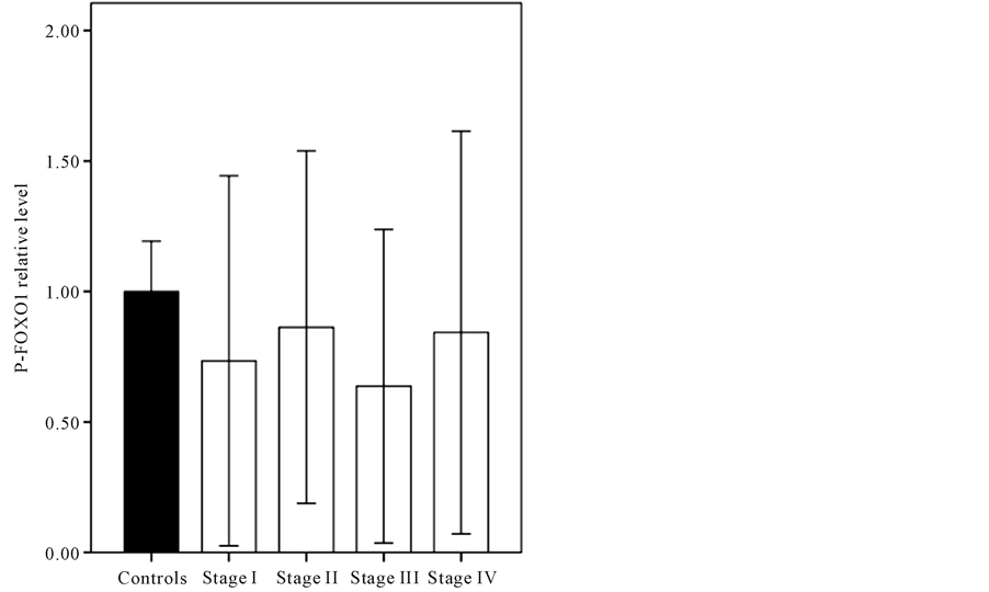 and then compared in terms of FOXO1 mRNA level. As it shown in Figure 3, the endometrial FOXO1 mRNA level of -FOXO1 group (0.78 ± 0.27) was lower than +FOXO1 group (1 ± 0.3) significantly (p < 0.05). The western blot analysis (Figure 4) showed that difference between endometrial tissue p-FOXO1 level of patients with endometrium cancer (0.77 ± 0.65) and the control group (1 ± 0.19) was not significant (p = 0.13). It was also found that difference between endometrial tissue p-FOXO1 levels of the various stages (I-IV) of endometrial cancer was not significant (p > 0.05) (Figure 5). It is noteworthy that FOXO1 and p-FOXO1 proteins were not detected in the 12 of patients. As it shown in Figure 6 the p-FOXO1/FOXO1 ratio of patients with endometrial cancer was higher (4.43 ± 0.38) than controls (1 ± 0.18) significantly (p < 0.01).