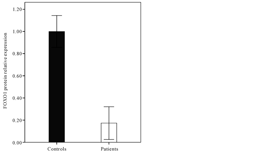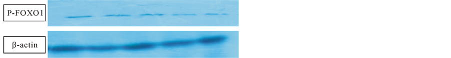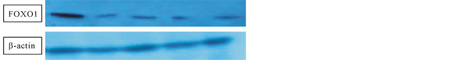 Western blot analysis of FOXO1 was performed as bellow: tissue samples were homogenized in a lysis buffer [10 mM HEPES (pH 7.6), 1.5 mM MgCl2, 0.5 mM DTT, 10 mM KCl, 10 mM NaF, 1 mM Na3VO4 and 10 µL Protease inhibitor cocktail (Sigma)]. After incubation at 4˚C for 15 min, NP-40 was added to a final concentration of 2%, total protein was extracted and following centrifugation (12,000 rpm for 30 min at 4˚C) the supernatant was collected and protein concentrations were determined, using Bradford method [12] . 75 µg of protein was subjected to western blot analysis and transferred to polyvinylidene difluoride (PVDF) membrane.