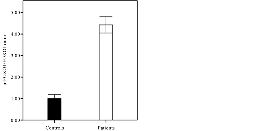 Figure 6. The p-FOXO1/FOXO1 ratio of patients with endometrial cancer (4.43 ± 0.38) and controls (1 ± 0.18) (p < 0.01).