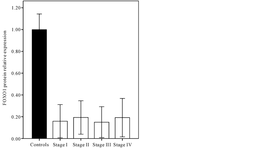 Figure 2. The comparison between FOXO1 protein levels of the various stages I-IV of endometrium cancer (p > 0.05). β- actin was used for normalization and loading control.