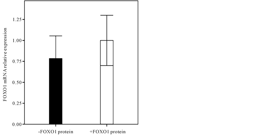 Figure 3. Comparison of FOXO1 mRNA level of +FOXO1 group (1 ± 0.3) with −FOXO1 group (0.78 ± 0.27) (p < 0.05).