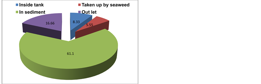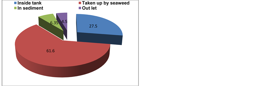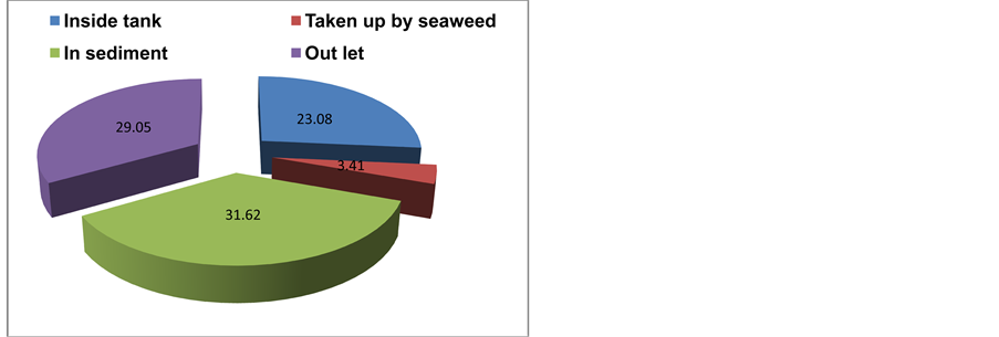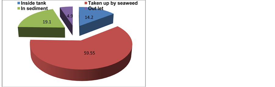 Nutrient budget showed that the maximum percentage of total nitrogen was removed by Kappaphycus alvarezii in both FTS (59.55%) and RS (61.6%) systems. Total nitrogen remaining the inside tank water of RS (27.5%) system was comparatively higher than the percentage of total nitrogen (14.2%) obtained inside the tank of FTS system. On the other hand, the highest amount of 19.1% total nitrogen was obtained in sediment of FTS system, while only 6.35% of total nitrogen was recorded in sediment of RS system (Figure 1 and Figure 2).