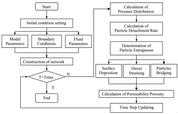 As shown in Figure 1, firstly, set the initial conditions, including model parameters, boundary conditions, and fluid parameters. Secondly, construct the pore network for formation parameters variation. Thirdly, based on the pore network model, calculate the formation permeability and porosity with the iterative method.