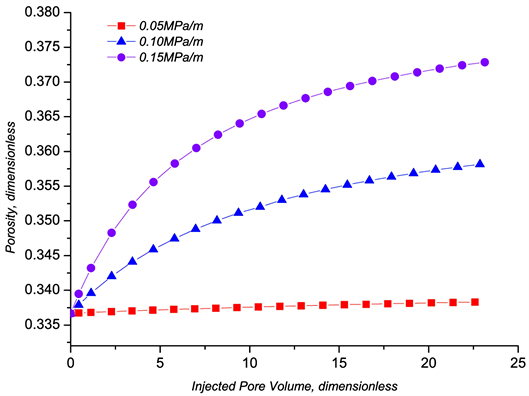 As shown in Figure 2, for a certain pressure gradient, permeability of the network increases gradually and the curve goes stable after long-term water flooding. For simulations at different pressure gradient, the permeability increases more quickly at higher pressure gradient. And Figure 3 reveals that the porosity variation principle is similar to that of permeability.