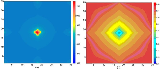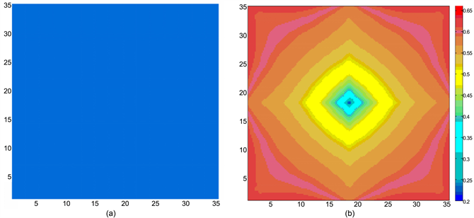 Figure 8. The permeability and remaining oil distribution when permeability ratio is 1. (a) Permeability distribution of the 2nd layer; (b) Remaining oil distribution of the 12th layer.