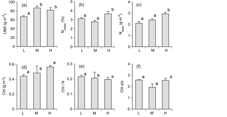 LMA was greater at middle and high elevations than at low elevation (Tukey HSD test, P < 0.05, Figure 1(a)). Nitrogen contents per leaf mass and leaf area were greater at high elevation than at middle and low elevations (Tukey HSD test, P < 0.05, Figure 1(b), Figure 1(c)). No statistical significant difference was detected among the three elevations for chlorophyll content per leaf area, chlorophyll/nitrogen ratio and chlorophyll a/b ratio (Figures 1(d)-(f)). Therefore, LMA and the nitrogen content per leaf mass were high at high elevation, and nitrogen allocation ratios to chlorophyll a and b showed no elevational differences.