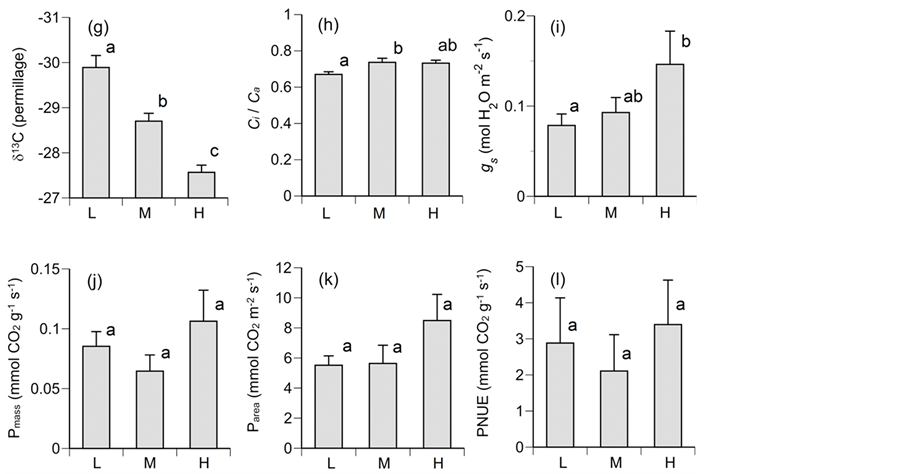 Figure 1. Leaf structural and physiological characteristics of Betula ermanii at low elevation (L, 1600 m a.s.l.), middle elevation (M, 2000 m a.s.l.) and high elevation (H, 2500 m a.s.l.). Mean values and standard errors are shown for (a) leaf mass per area (LMA), (b) nitrogen content per leaf mass (Nmass), (c) nitrogen content per leaf area (Narea), (d) chlorophyll content per leaf area (Chl), (e) ratio of chlorophyll to nitrogen (Chl/N), (f) Chl a/b ratio, (g) stable carbon isotope ratio (δ13C), (h) ratio of intercellular to the ambient CO2 partial pressure (Ci/Ca), (i) stomatal conductance (gs), (j) photosynthetic rate per leaf mass (Pmass), (k) photosynthetic rate per leaf area (Parea), and (l) photosynthetic nitrogen use efficiency (PNUE). Stomatal conductance and photosynthetic rates were measured at photosynthetic photon flux density 1000 μmol∙m−2∙s−1. Same letters indicate no significant difference at the level of 0.05 by the Tukey HSD test in each graph.