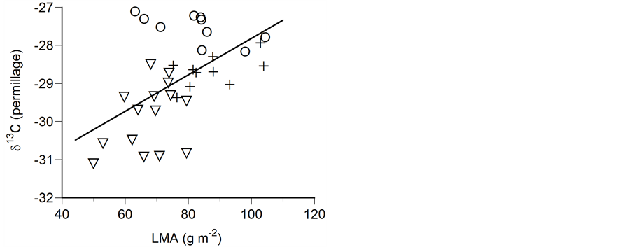 Figure 2. Relationship between leaf mass per area (LMA) and stable carbon isotope ratio (δ13C) for Betula ermanii leaves from low elevation (1600 m a.s.l., triangle), middle elevation (2000 m a.s.l., cross) and high elevation (2500 m a.s.l., circle). The regression line is Y = 0.043 X − 32.19 (F1,33 = 10.8, P < 0.01, R2 = 0.224) for pooled data of the three elevations.