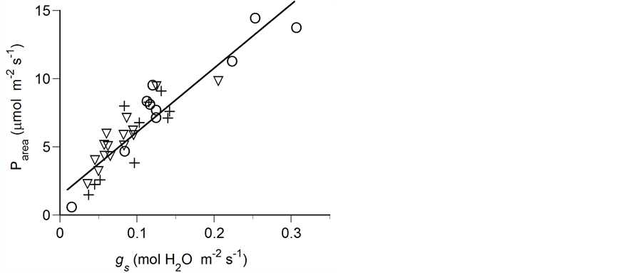 Figure 4. Relationship between stomatal conductance (gs) and photosynthetic rate per leaf area (Parea) at photosynthetic photon flux density 1000 μmol∙m−2∙s−1 for Betula ermanii leaves from low elevation (1600 m a.s.l., triangle), middle elevation (2000 m a.s.l., cross) and high elevation (2500 m a.s.l., circle). The regression line is Y = 46.23 X + 1.688 (F1,33 = 167.4, P < 0.001, R2 = 0.830) for pooled data of the three elevations.