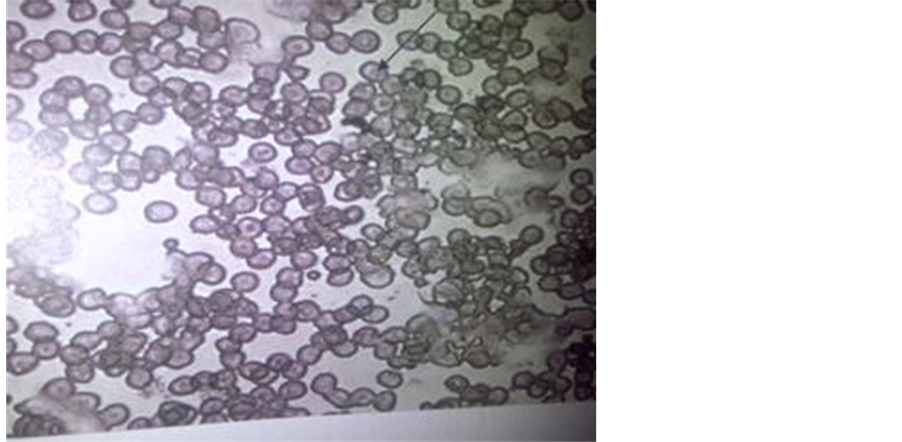 Figure 1. Photomicrograph of an adult female catfish blood exposed to diazinon with an arrow showing a micronucleated polychromatic erythrocytes cells (May-Grunnwald ×400).