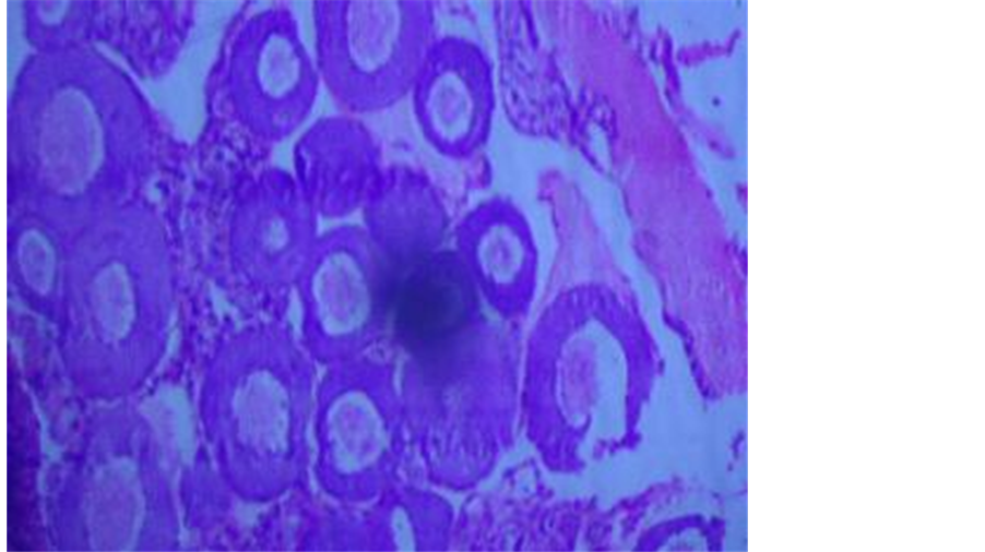The group exposed to the no effect concentration (0.405 ppm) of diazinon had distorted mature ovarian cells as shown in Figure 2 when compared with Figure 3 the normal ovary and the testes had locally extensive testicular degeneration as shown Figure 4 when compared with Figure 5 the normal testis.