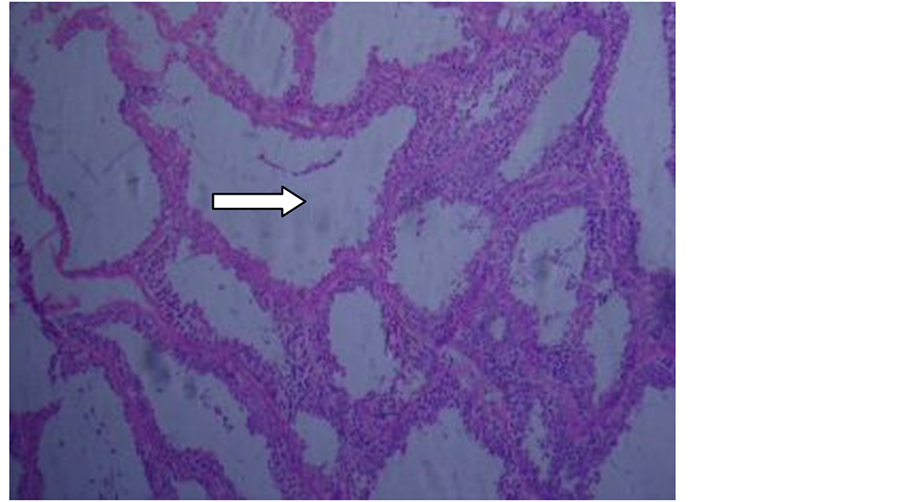 Figure 4. Photomicrograph of the testis with arrow showing extensive testicular degeneration (H & E) M: ×400 (At 28 days of exposure).