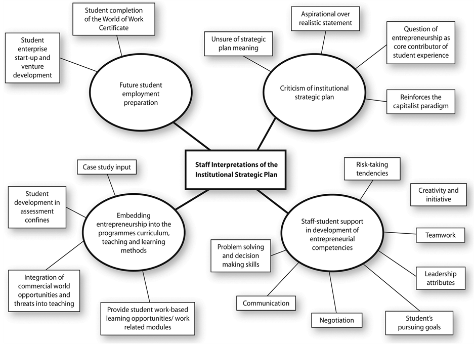 Figure 2. Themed mind map to illustrate the responses to the questions “what does enterprise/entrepreneurship mean in your university’s strategic plan?”.