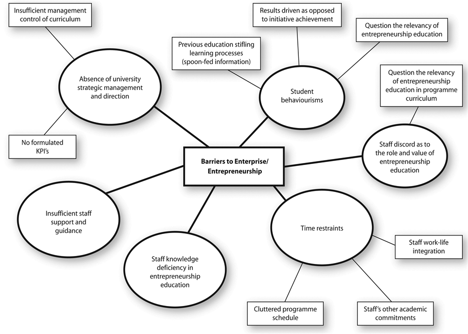 Figure 3. Themed mind map to illustrate the responses to the question “what are the barriers to enterprise/entrepreneur ship?”.
