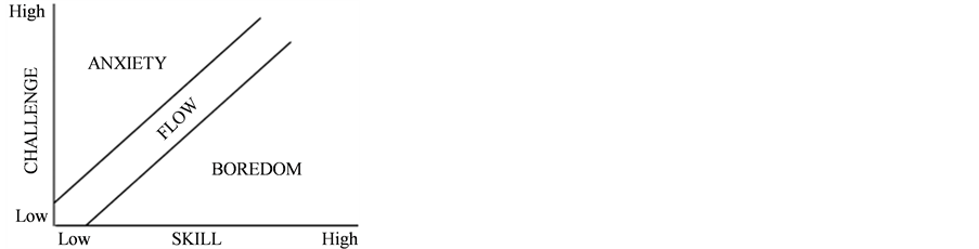 The state of “Flow” can be described as the psychological situation of someone who is involved in a pleasant and enjoyable, for himself, activity in the course of which they appear to be totally preoccupied in what they do. In order to be found in such a psychological situation, they have to meet two factors which play the most important role: (1) the, perceived by them, difficulty of challenge they have to face and (2) their, perceived by them, skill to deal with this challenge. Therefore, even a low difficulty activity is able to induce Flow state when there is balance between these two factors. In the case of imbalance, a person can feel Anxiety when they consider that they have a lower degree of skills than those needed to complete the activity and Boredom when the opposite happens. The relation between these two factors has been represented on a model (Figure 1), where the psychological state of Flow constitutes a channel (Csikszentmihalyi, 1975) .