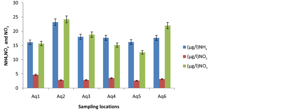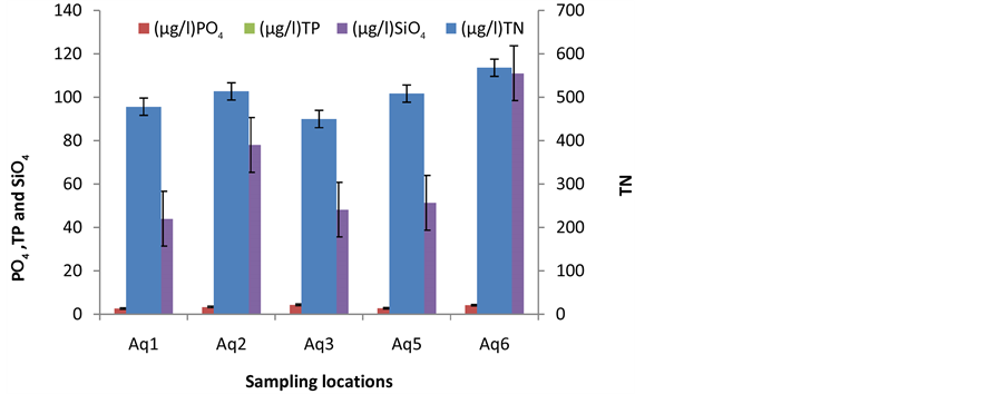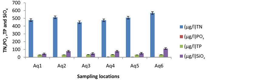Ranges as well as regional average values of different nutrients are listed in Table 5. The results indicated that dissolved inorganic nitrogen concentrations were relatively low. Over most of the basin, Gulf of Aqaba surface waters are exceptionally clear and low in nutrients because the hot, and arid climate. On the meantime, there is little nutrient input from soil, agriculture and pollution on land. It also creates a permanent surface layer of warm, nutrient-poor water, which does not mix with nutrient-rich deeper water in a process called stratification [67] [68] . They ranged from 3.72 μg/l NH4-N at AQ 05 & AQ 06 to 92.95 μg/l NH4-N at AQ 02 for ammonium; 0.36 μg/l /l NO2-N at AQ 05 to 26.89 μg/l /l NO2-N at AQ 01 for nitrite; from 2.49 μg/l /l NO3-N at AQ 0 to 97.67 μg/l NO3-N at AQ 0 for nitrate and from 20.16 to 2878.40 μg/l N at AQ 0 and AQ 0, respectively for total nitrogen. In general, dissolved inorganic nitrogen constituted
