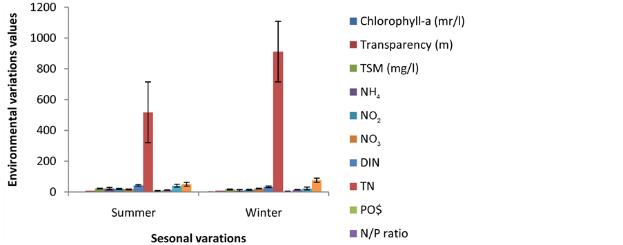 Chlorophyll-a (Chl-a) was measured in 3L water samples after collection and filtration by using 0.45 µm filters. Chl-a was extracted using 90% acetone and measured spectrophotometerically according to [44] . Ammonium ion concentrations were determined according to [45] . Nitrite, Nitrate, reactive phosphate and reactive silicate concentrations were determined on pre-filtered seawater samples (Whatman GF/C) following the sepectrophotometric techniques described by [44] [45] by using HACH DR-2000 direct reading spectrophotometer. Total P and total N were estimated in unfiltered water samples following the procedure described by [46] . Total suspended matter (TSM) was collected from 3 L seawater samples by filtration through washed, dried and pre- weighed 0.45 µm membrane filter. The filters with the retained particles were washed then air dried in the oven at 60˚C for 24 - 48 hours until constant weight. The difference between the dry weight of membrane filters before and after filtration was expressed in mg/l [44] . Transparency was measured by secchi disk. The concentration of dissolved inorganic nitrogen (DIN as the sum of NH4-N + NO2-N + NO3-N) was calculated.