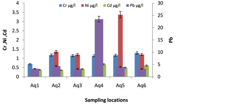 Cu (3.44 μg/l) > Pb (3.59 μg/l) > Mn (2.24 μg/l) > Ni (1.61 μg/l) > Cr (1.10 μg/l) > Cd (0.49 μg/l)