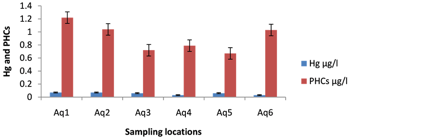 Total petroleum hydrocarbons in the investigated area ranged from 0.18 µg/l at AQ 01 and 5.50 µg/l at AQ 01, with an average of 0.91µg/l (Table 6). Among all studied locations, AQ 01 at Ras Mohamed area exhibited the maximum average concentration (1.22 µg/l) of petroleum hydrocarbons. AQ 05 at Neweiba Harbor El Saiadin area showed the minimum average one (0.67 µg/l). The coastal waters at AQ 01 (Ras Mohamed), AQ 02 (Sharm El-Sheih Harbor), and AQ 06 (Table 6) areas were much suffered from oil pollution compared to the other areas (Figure 4(a)) which is mainly due to accidental,