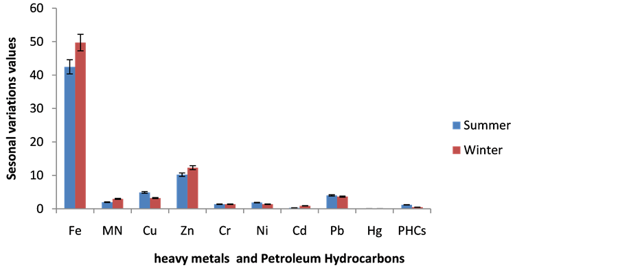 deliberate or operational discharges and spills of oil from ships [2] - [5] [7] [8] . Furthermore, seasonal variations showed concentrations of petroleum hydrocarbons ranging from 0.18 to 1.07 μg/l, with an average value of 0.50 μg/l which were significantly lower in winter compared to their corresponding values (0.41 - 6.31 μg/l, av. 1.20 μg/l) in summer (Figure 4(b)). The higher concentrations of petroleum hydrocarbons in summer are mainly attributed to the increase in the levels of oil pollution that most probably resulted from an increase in accidental, deliberate or operational discharges and spills of oil from ships [2] - [5] [7] [8] . In general, the maximum concentration was much lower than the harmful concentrations reported for seawater. On the other hand, the reported concentrations are very far below the accepted level given by EEAA of Egypt and that recorded by the International level of 500 µg/l.