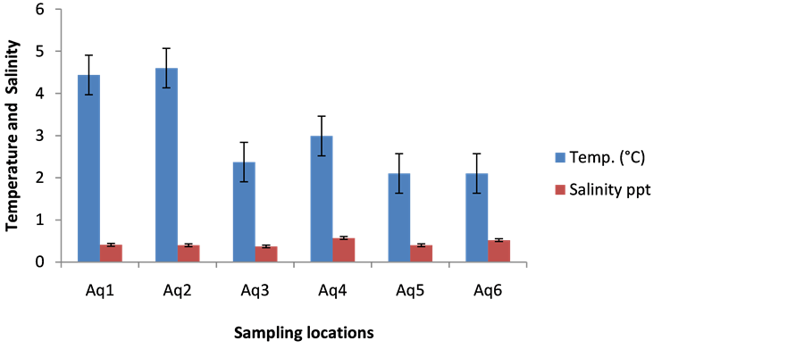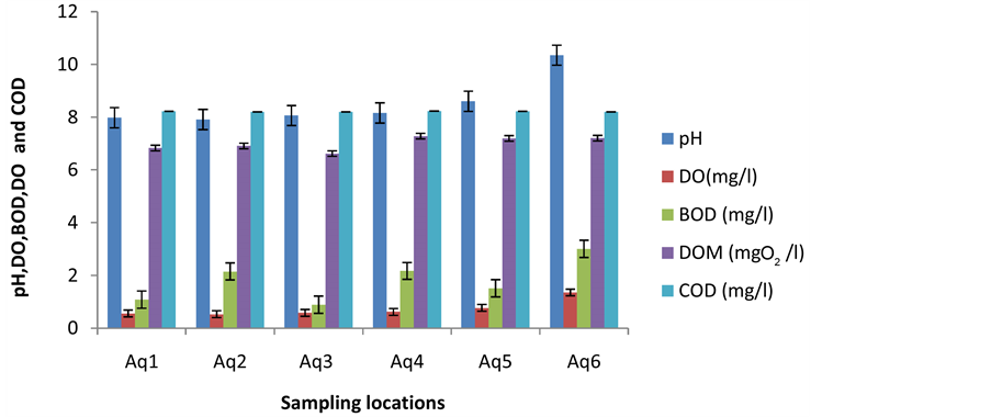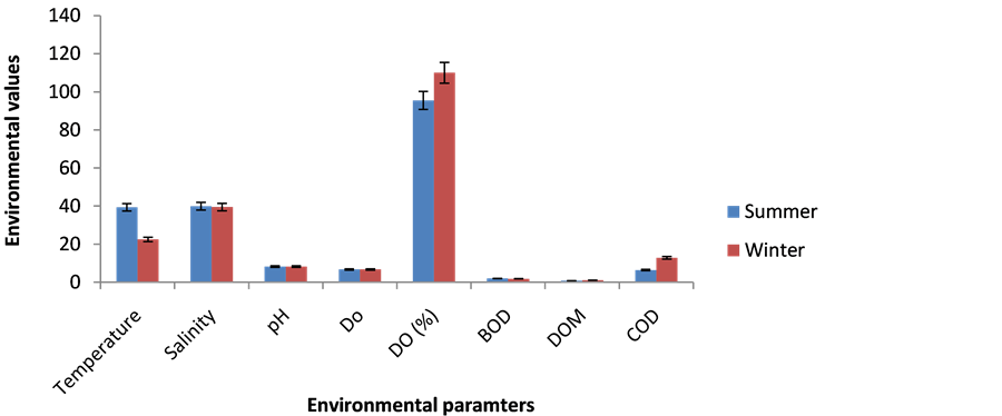 The hydrographic parameters (water temperature, salinity, pH, Transparency, dissolved oxygen (DO) were measured in situ at each station using CTD (YSI-6000). Transparency was measured by secchi disk. Dissolved oxygen was also measured using modified Winkler method [42] . Biological oxygen demand (BOD) samples were kept in incubator and fixed after 5 days and their DO contents were determined. Dissolved organic matter (DOM) was carried out using potassium permanganate according to the method described by [43] , and chemical oxygen demand (COD) was determined by the dichromate closed reflux titrimetric method [42] .