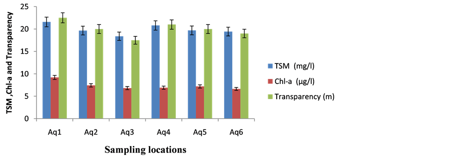 Ranges and regional average values of Chl-a, TSM and Secchi Disk depth are reported in Table 5. In general, low Chl-a and TSM concentrations and relatively high transparency were generally encountered at most stations revealing that the effect of human impacts in on the Aqaba Gulf coastal waters is still not significant [18] [19] [22] [25] [27] [65] . The levels of Chl-a were fluctuated between 0.014 μg/l at AQ 05 in August, 2012 to 2.38 μg/l at AQ 06 in May, 2012 with a spatial average of 0.40 μg/l. Total suspended matter ranged from 12.09 mg/l at AQ 01 in March, 2011 to 31.98 mg/l at AQ 05 in May, 2013 with a spatial average of 16.53 mg/l. Secchi disk transparency, on the other hand, ranged from 5.40 m at AQ 02 in March, 2011 to 12.00 m at AQ 06 in July and September, 2011 indicating the very limited impacts of human impacts due to the low population in the region, and the limitation of land-based sources, i.e., sewage, agriculture and/or industrial effluents [18] [19] [25] . Irregular regional distributions (Figure 3(a)) of total suspended matter, secchi disk transparency and chlorophyll-a were observed. The present study indicted higher total suspended matter (21.57 mg/l) at AQ 01, secchi disk transparency (12.0 m) at AQ 06, and chlorophyll-a (0.55 μg g/l) at AQ 03. On contrast, the lower values were (18.39 mg/l) at AQ 03, (6.0 m) at AQ 01 & AQ