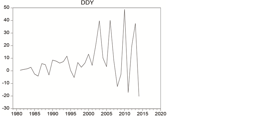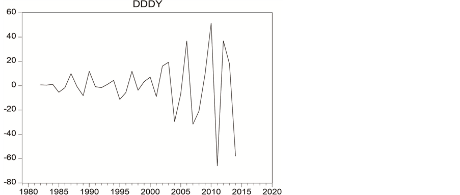 We obtain total local GDP in Shenzhen from 1979 to 2014 from “Shenzhen statistical yearbook”, and use time series yt to express it. GDP growth trend diagram is made according to these data (Figure 1), which roughly shows long-term rise trend of yt, instead of being steadily flat. The first order difference of the original GDP sequence is performed by using eviews6.0 software (Figure 2), which still roughly shows it is not steadily flat. After second order differencing, it is difficult to see whether the time series of the two order difference is stable (Figure 3), then we perform ADF unit root test on the series, and use model of inconstant term and trend term for testing, and determine lagging order number of model is 3 according to AIC rule. The test result is as shown in Table 1 and Table 2. Statistics value of second order difference ADF is 1.638473, which is greater than the critical values in three different significance levels and means that second order difference series is non-stationary. Then we go on to third order differencing (Table 2 and Figure 4). We find that ADF statistics is −3.748875, smaller than critical values in three different significance levels, then series after third order differencing is stationary. So we think difference order number d of ARIMA (p, d, q) model is equal to 3.
