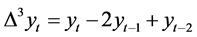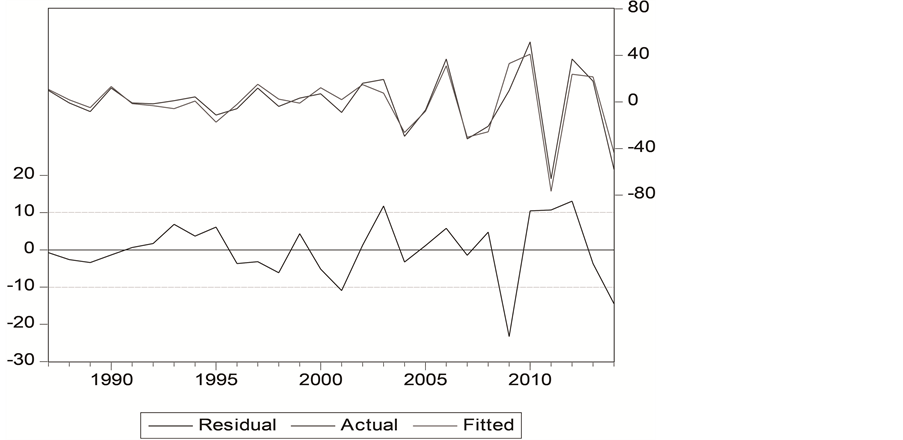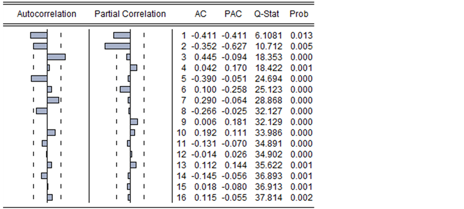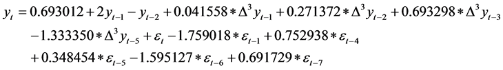 The results of autocorrelation function test to sequence D3yt, which can be seen in Figure 5, show that the autocorrelation coefficient (AC) and the partial autocorrelation coefficient (PAC) are not stable and respectively reduce from the eighth order and sixth order. So according to the Akaike info criterion and Schwarz criterion, the value of p and q are combined for 30 groups ARIMA (p, 3, q) [p = 2, 3, 4, 5, 6; q = 3, 4, 5, 6, 7, 8] model. By constantly adjusting the order, then residual autocorrelation tests of equation, tests of goodness of fit, we try to make the model fit the best. Ultimately we take the best p, q values were 5, 7, the following ideal ARIMA (5, 3, 7) model was get. The estimated results of the model by using eviews6.0 software are as follows: