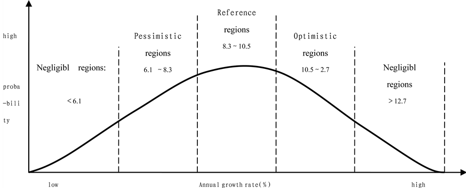 After combination of previous conclusion about status quo analysis, the probability of “mesoscopic” scene is the highest, so it is taken as “reference scene” (Figure 9). Against this background, in 2016-2020, average annual rate of GDP growth is 9.5%. After error adjustment, the economic growth rate in “reference scene” is between 8.3% - 10.5%. The probability of “optimistic” or “pessimistic” scenes is relatively lower, so they are taken as sub-reference scenes. In “optimistic/best” situation, in 2016-2020, the average annual rate of GDP growth is 11.5%. After error adjustment, the economic growth rate in “optimistic scene” is between 10.5% - 12.7%. In “pessimistic/risk” scene, in 2016-2020, average annual rate of GDP growth is 7.1%. After error adjustment, in “pessimistic scene”, the economic growth rate is between 6.1% - 8.3%. Probability of other “extreme” scenes is extremely low, at two terminals of “pessimistic” scene and “optimistic” scene, and the economic growth rates are lower than 6.1% and higher than 12.7%, which is negligible.