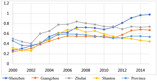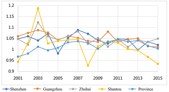Guangzhou has similar efficiency trends with Shenzhen, but overall lower than Shenzhen’s development trend. After 2006, the difference of the efficiency between two cities gradually increased. As special economic zones, the efficiency of Zhuhai and Shantou maintained growth before 2007, but gradually declined