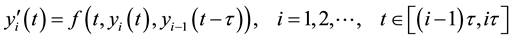 There are many methods to deal with the delay differential Equation (3). For example, linear multistep (LM) methods, Runge-Kutta (RK) methods, waveform relaxation (WR) methods, etc. However, the basic idea to solve the DDE (3) is to solve the following system of ODEs step by step:
