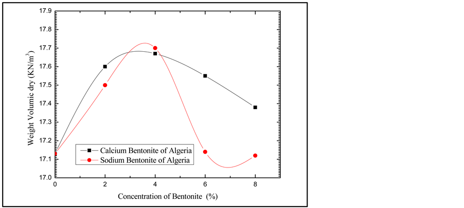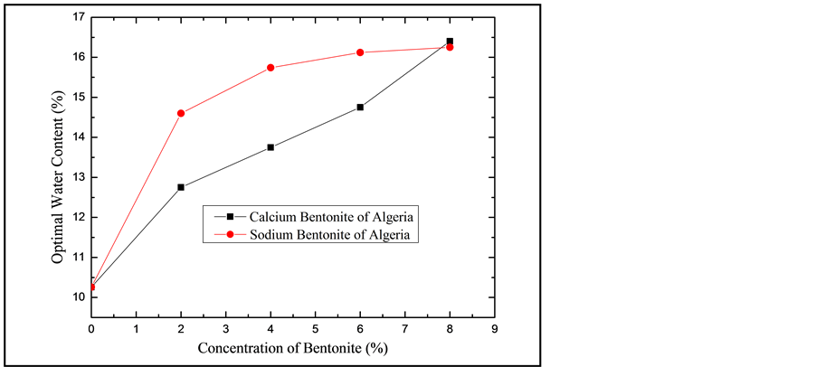 The two curves on Figure 7 show that the optimum water content is directly proportional to the concentration of bentonite. Furthermore, the optimal water contents of the mixtures of SB, are higher than those of mixtures of CB. This is explained by the high specific area, the plasticity index -to high-, the high rate of swelling of the SB of Maghnia (Table 3), and therefore a greater adsorption capacity than that of the CB of Mostaganem.