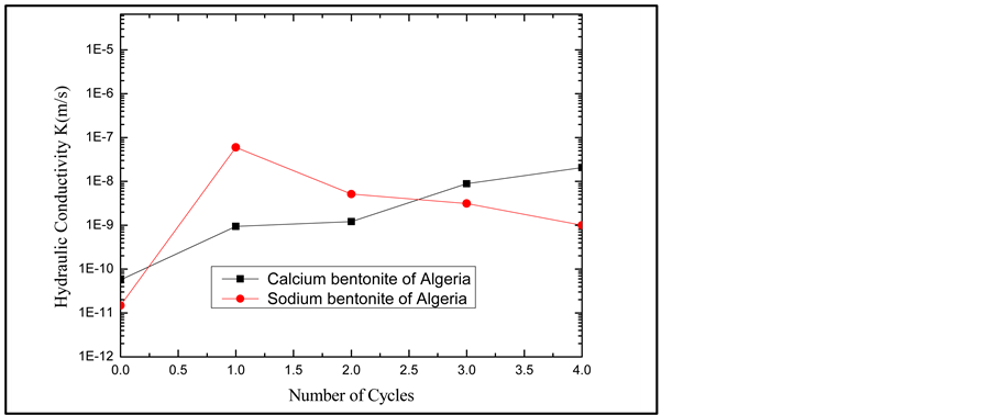 The Figure 10 illustrates, that the CB loses its adsorption capacity, and therefore its permeability increases during humidification-drying cycles , this is explained by the calcium nature of this one [17] . Inter alia, the partial exchange of sodium ions by calcium ions, present in solution of the liquid hydration, leads to degradation of the swelling properties and waterproofing [18] . The degradation of hydration properties, resulting from the application of climatic stress over time (wetting-drying cycles), is much more pronounced for CB. In fact, the drying of the CB leads to a quasi-irreversible aggregation of the particles’ face to face. This mixture loses the much of its swellability, which leads to the signifive increase of the permeability. Cracks appear in the drying and disappear during the hydration phase, the CB mixture loses its swelling capacity, and hence the self healing ability decreases. While the SB does not lose its adsorption capacity under cyclic effect, and hence its permeability keeps values in accordance with the Algerian regulations. In fact, the samples of SB mixing exposed to repeated