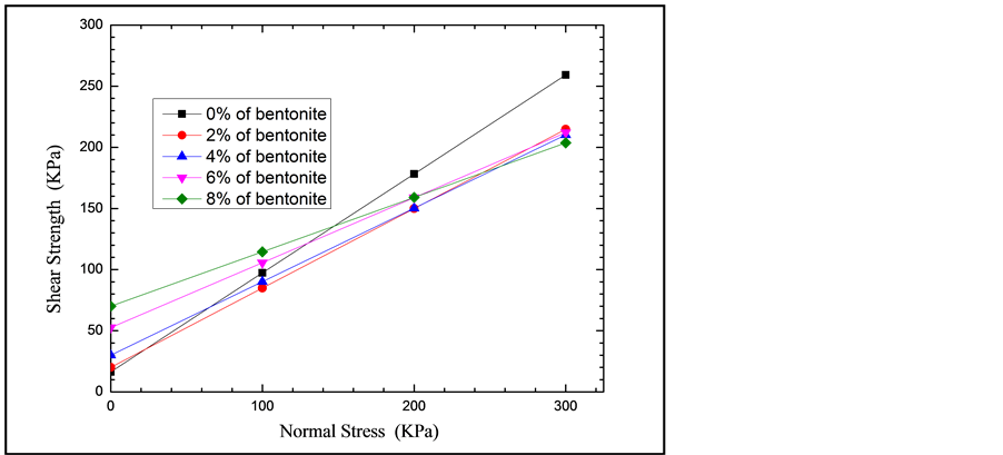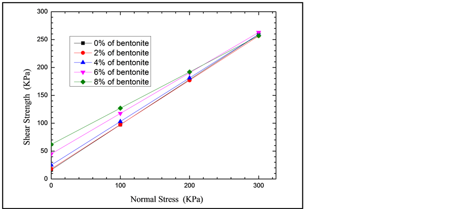 Figure 14. Mohr-Coulomb straight intrinsic for different percentages of bentonite (CD).