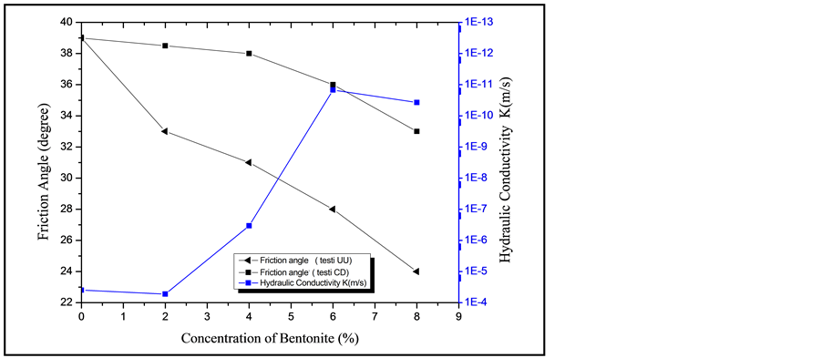 The addition of bentonite led to a low permeability of about 1 × 10−11 m/s, but can create a problem in the mechanical stability, which leads us to take precautions, for the achievement of the sloping waterproof barriers. In agreement with the literature, the hydraulic conductivity and friction angle are conversely proportional to the increasing of bentonite content [7] .