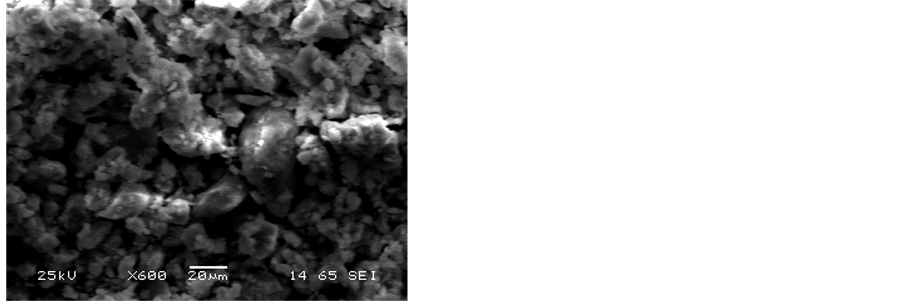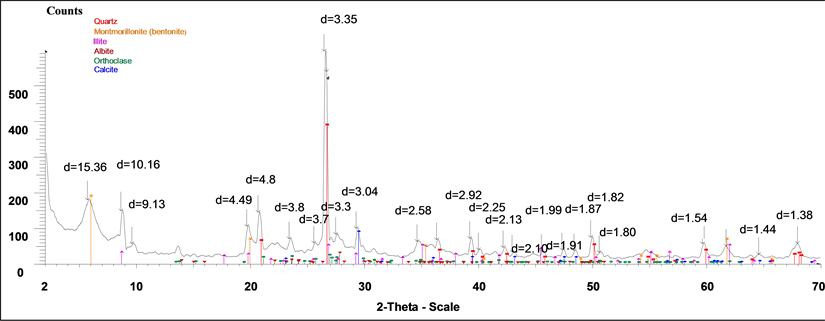 The X-ray diffraction patterns of the both of used bentonites, shown in Figure 2(a) and Figure 2(b), show the presence of montmorillonite (translated by the peak corresponding to an interplanar spacing of 15.36 A˚ in bentonite of Mostaganem. Furthermore the appearance of illite, quartz, calcite and traces of felspath (orthoclase and albite) is found (Figure 2(a)) [3] . While in the bentonite of Maghnia, the montmorillonite is predominant compared toimpurities such as quartz, orthoclase and some traces of calcite (Figure 2(b)).