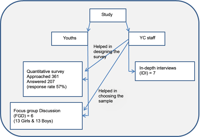 This study can be seen as an explanatory mixed-methods study, using Creswell and Plano Clark’s approach [29] , whereby qualitative data helps to explain initial quantitative results. Data were collected at the two youth- centers using surveys, individual interviews, and focus-groups interviews.