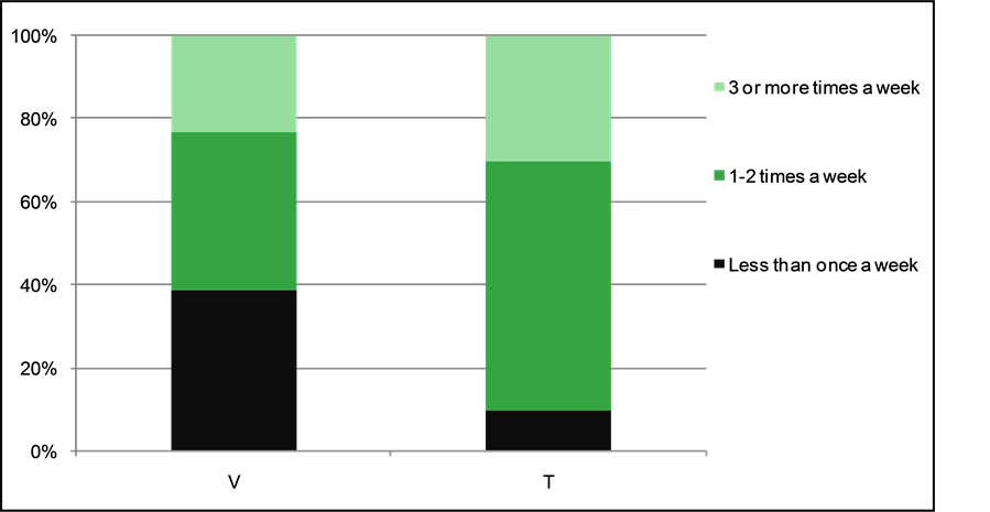 There are also some differences worth noticing between the adolescents at the two youth-centers. At V there is a higher proportion of youth who were born in Sweden, but a lower proportion whose parents were born in Sweden or Europe. At V there are also more young people who live with both parents and fewer who live in a rented apartment. More of the youth at V also have mothers who work and they enjoy school to a greater extent. Almost everyone at T lives within walking or biking distance of the youth-center; at V more than a third live farther away. The young people’s frequency of attendance has significantly different distributions at the two youth-centers (Figure 2). At V more than one third of the adolescents participate less than once a week, compared to one tenth at T.