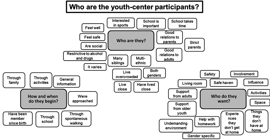 The content analysis of qualitative data collected at the two youth-centers resulted in three themes (Figure 3) which support the results of the survey on some issues and deepen and widen the understanding of some issues.