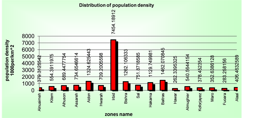 From this graph can be a statement more areas that require priority for intervention Urban them to provide the necessary services, including health services, educational and commercial where it turns out that most of the population of the city of Irbid they make a purchase widgets from the city center any so-called zone of the old center Alhisbeh and this is an addition to the movement mobility of staff to their duty stations traffic jams at times exceed the morning rush hour and evening. Figure 7 and Figure 8 show distribution of the population in the areas of Greater Irbid Municipality [1] . The documentation of GIS department project 2000-2004.