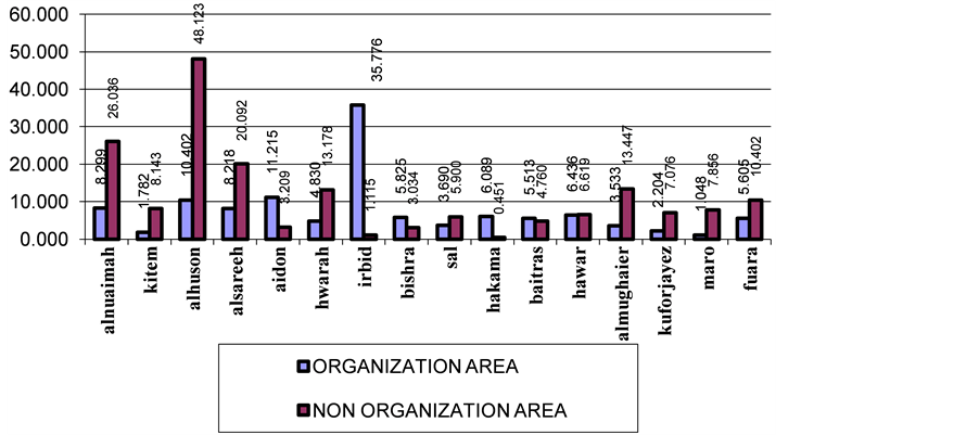 Figure 8. Distributed areas and areas of the organization within the Greater Irbid Municipality. Ref/The documentation of GIS department project 2000-2004.