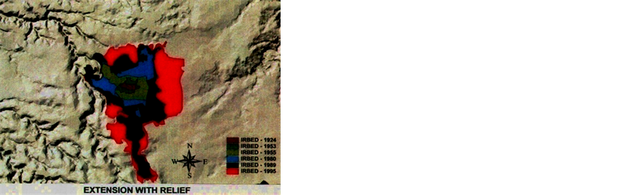 Figure 10. The limits of the city of Irbid through the satellite image and show the natural terrain and areas of flat also shows time periods successive expansion of the city coupled with the time period and the reasons for this expansion also shows the wrong direction, in the direction of urbanization, which is, in fact, the expansion of a random city.
