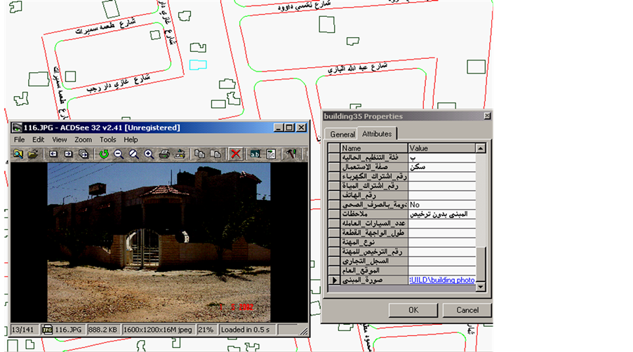 Scheme shows the streets of the city of Irbid and their names indicating the buildings that are located on these streets with all the data for these buildings, and images and the names of the owners and the number of inhabitants and the phone number where the use of such data in several purposes, the most important statement of the title to the house through a dial-up only Call center also benefited from the Department of Finance in the collection of tax and Almsagafat estimate this tax through these pictures where the value is calculated automatically by the software accompanying the GIS software (Figure 18 [4] ), which facilitates a lot of effort and fuss in the disclosure on the ground and repeat it again.