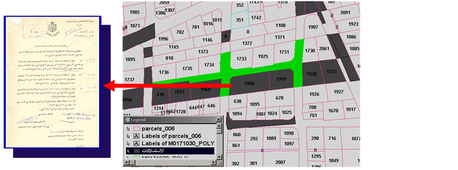 Figure 18. Scheme through GIS software shows pieces of land and leftover and the corresponding attached pictures for official referenda letter planned acquisition of the Supreme Council of the organization as released [1] .