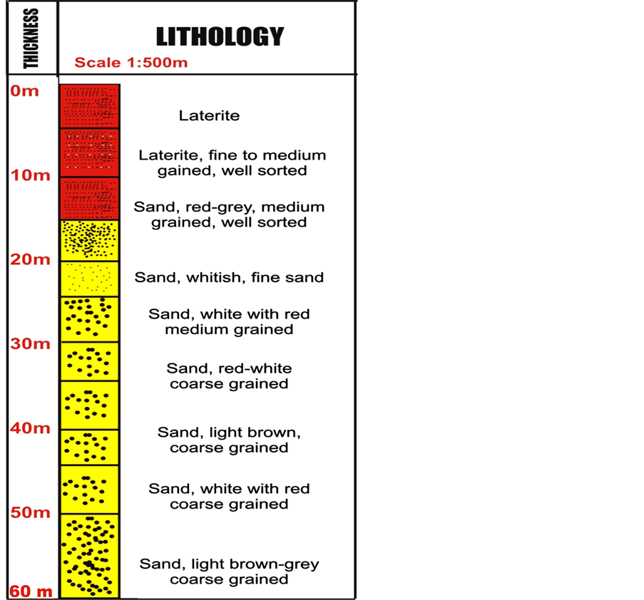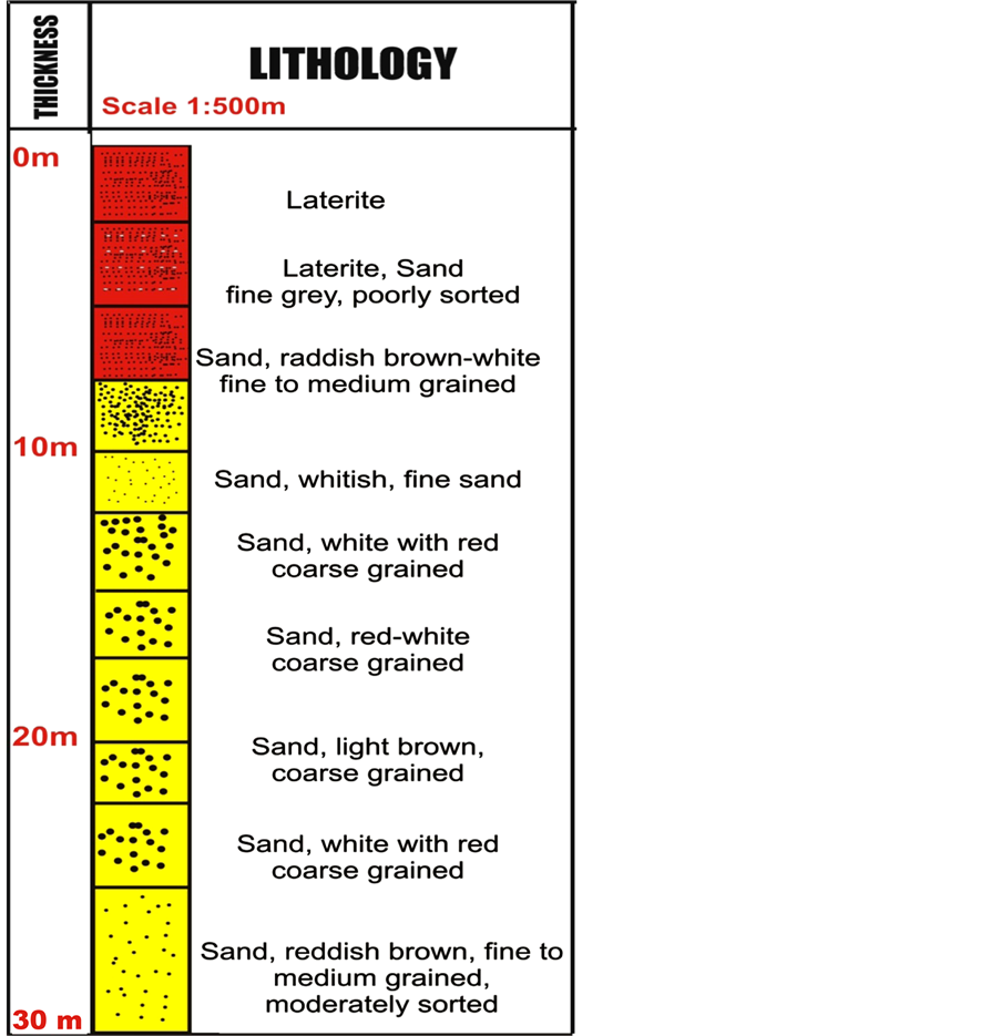 The Niger Delta consists of three main tertiary stratigraphic units overlain by Quaternary deposit [14] shown in Table 1. These three subsurface stratigraphic units in the Niger Delta are Benin, Agbada and Akata formations. The base is the Akata formation comprising mainly of marine shale and sand beds consisting of dark grey sandy, silty shale with plant remains at the top. It is over 4000 ft thick. The underlying Agbada formation is a sequence of sandstones and shales [15] . It consists of an upper predominantly sandy unit with minor shale intercalations and a lower shale unit which is thicker than the upper sandy unit. It is over 10,000 ft thick. The aquifer in the Benin formation is largely phreatic. These formations are overlain by various types of Quaternary deposits [15] . These areas are made up of top soil, red laterite, clay, fine sand, medium sand and coarse sand in form of